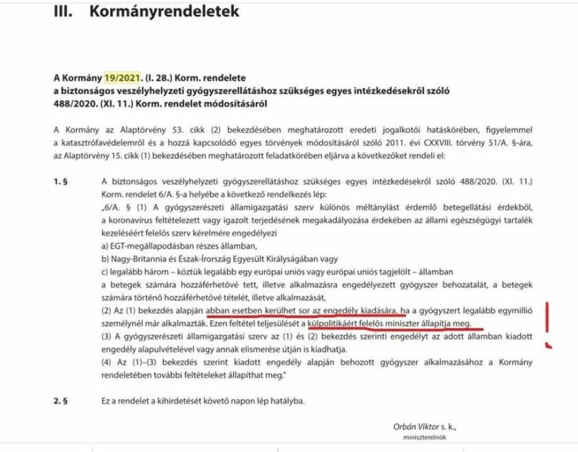 A mai Közlönyben viszont feketén-fehéren ott áll: ha egy vakcinával BÁRHOL, BÁRMILYEN ELLENŐRIZETLEN MÓDON beoltottak már egymillió embert, akkor lehet vele nálunk is oltani. A feltétel teljesüléséről pedig a külügyminiszter (!!!) dönt.