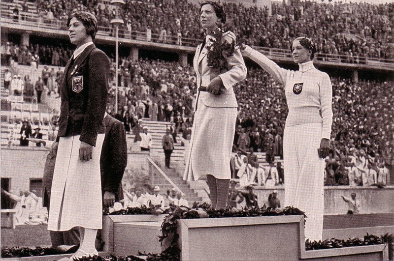 A kép az 1936-os berlini olimpia női tőr bajnokait ábrázolja az eredményhirdetésen. A náci karlendítést a győzelemre esélyesnek tartott, 26 éves német Helene Mayer mutatja be, akiről a világsajtónak az volt a véleménye, hogy lehetetlen elvenni tőle a győzelmet. A dobogó tetején a 29 éves magyar Elek Ilona. Mindketten zsidó származásúak. Nem sokon múlt, hogy egyikük sem vett részt az olimpián.
