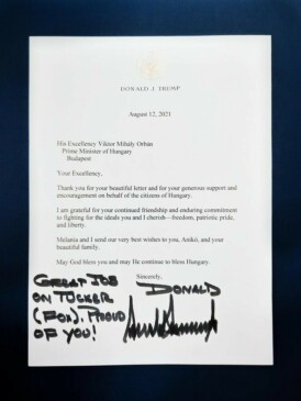 Trump – aki még mindig ki van tiltva a legnagyobb közösségimédia-platformokról, amióta januárban felhergelte a híveit, akik közül sokan megostromolták a Capitoliumot – külön kézzel írta oda, hogy szép munka volt a foxos Tucker Carlson magyarországi show-ja, és: „Büszke vagyok rád!”