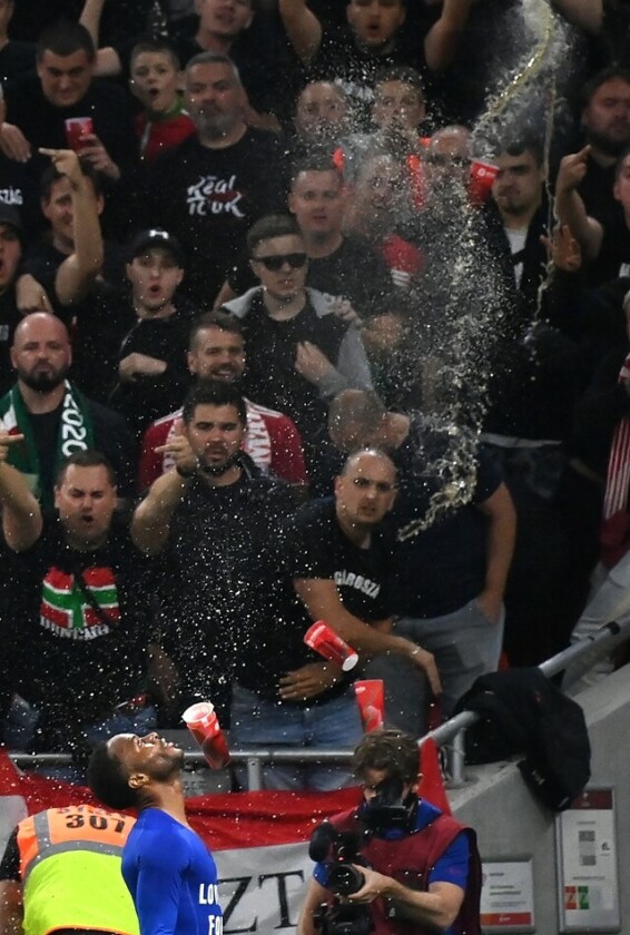 Söröspoharakkal dobálták meg a magyar szurkolók az angol válogatott támadóját, Raheem Sterlinget, miután megszerezte a vezetést a magyar csapat ellen csütörtök este a Puskás Arénában. Az MTI fotóján jól látszanak a Sterlingnek bemutató és az őt célba vevő szurkolók.