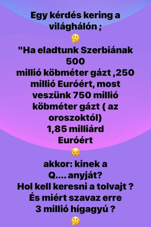 Akkor meséld már el fideszes nagyarc, hogy miért is adtátok az gáz és a villany árát rezsicsökkentett áron is többért 6 éven keresztül, mint a világpiaci ára volt! Több száz milliárdot húztatok ki így az emberek zsebéből. Akkor nem hallottalak pofázni! Köszi!