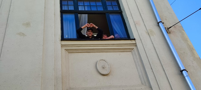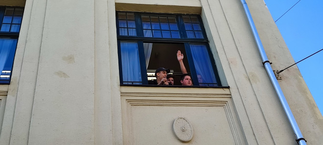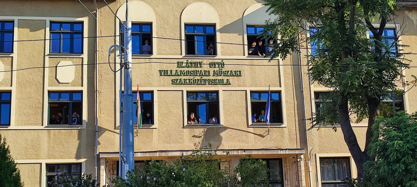 A két miskolci iparos iskolai diákjai is üdvözölték a jobbára elit iskolákból érkező gimiseket. A Gépipari és a Bláthy diákjai integettek. A Tehetséggondozó az utcán kíváncsiskodó munkatársa azonban perrel fenyegetőzött .