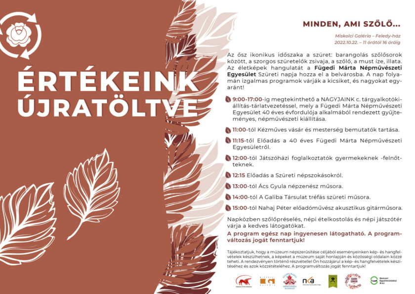 a must íze, illata. Az életképek hangulatát a Fügedi Márta Népművészeti Egyesület Szüreti napja