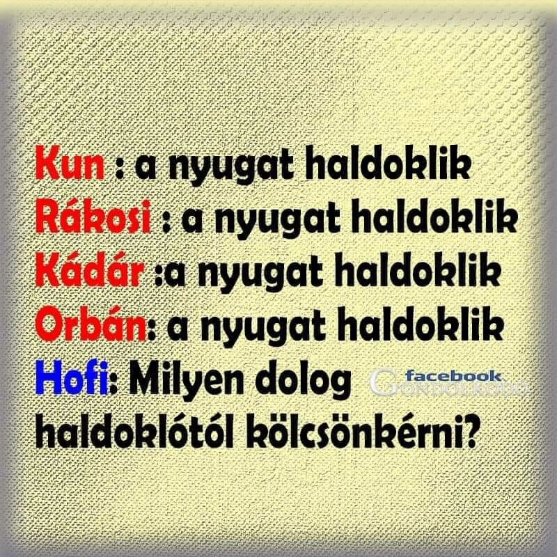 Vagyis Kun Béla, Rákosi Mátyás, Kádár János, Orbán Viktor hazudott. Ugyanis nem haldoklik a nyugat. Bárcsak Magyarország haldoklana annyira mint a nyugat mert akkor itt a szegény is gazdag lenne. Valamint mindannyian az Orosz birodalmat éltették. Ez bűn. Orbán is kommunista propagandát folytat magyarán a múltat restaurálja a jelenbe ez bizony nagy bűn. Sokan meg be is nyalják neki sajnos. Megérett az idő egy általános rendszer elleni tüntetésre. Tanár diák tüntetés ide kevés lesz ,hogy valami változzon. Egyébként pedig tényleg micsoda dolog egy haldoklótól kölcsönt kérni ! Ejnye !