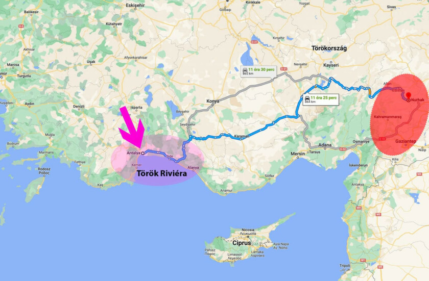 | Pirossal jelöltük a földrengés sújtotta területet és az epicentrumát. Ettől a résztől több mint 800 km-re található Antalya a török riviéra fővárosa. |
