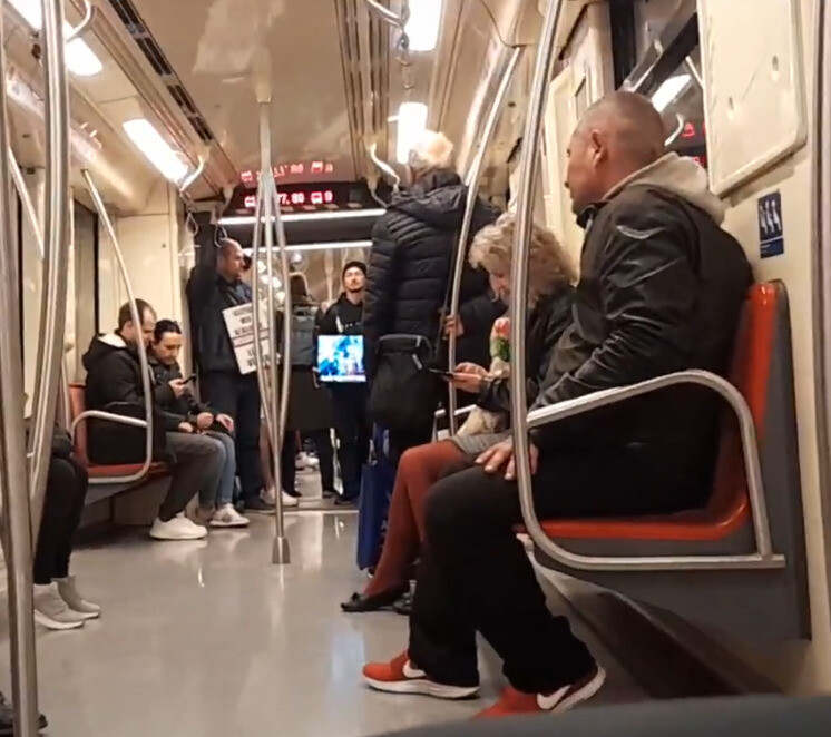 Vasárnap délután az M2-es metrón két férfi a rituális vágás betiltása mellett kampányolt. Egyikőjük képernyőt tartott maga előtt, amelyen a kóser vágásról szóló film forgott, míg a másik férfi egy táblát mutatott fel.