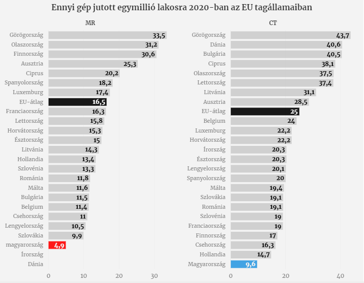 Az így kapott adatok alapján készült ábrán jól látszik, hogy mindkét kategóriában Budapesten a legjobb a helyzet: ott egy közfinanszírozott MR-készülékre 69 ezer ember jut, egy közfinanszírozott CT-re pedig 39 ezer fő. A helyzet Pest megyében a legrosszabb, ahol 332 ezer ember jut egy ilyen CT-re, és a mindössze egy darab TB-támogatott MR-készüléknek kell kiszolgálnia a megye teljes lakosságát, ami 1,3 millió fő.