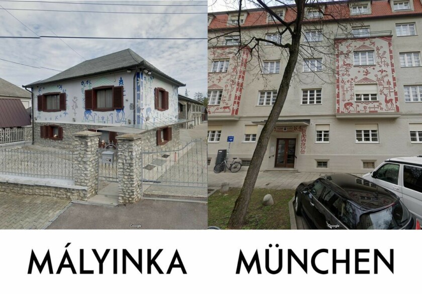 A Theodor Mayer tervezte épületben a müncheni bajor Udvari Művészeti Intézet működik. A magyar ház falára a német tulajdonosa saját kezűleg applikálta a mintákat a Google Street View alapján 2011-ben.
