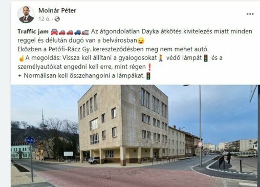 A Dayka utca térségében megvalósuló forgalomcsillapítási intézkedést részeként csomópont létesül a Szent István téri gyalogos átkelőhelynél, továbbá létrejön a Meggyesalja-Rácz György utca csomópont és a Rácz György-Petőfi utca csomópont.”