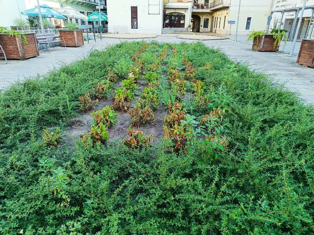Bár az idén nem jelentkeztek örökbefogadók, de sikerült megtévesztésig olyan eredményt produkálni, mint amit a padtársak „gondoznak”. Utánuk még a földet is el kellett távolítani. Most is efelé tartunk, mert „természetesen” nincs aki gazolgatna, ahogy fogy az ágyásból a hortenzia, úgy gyarapodnak a gyomnövények.
