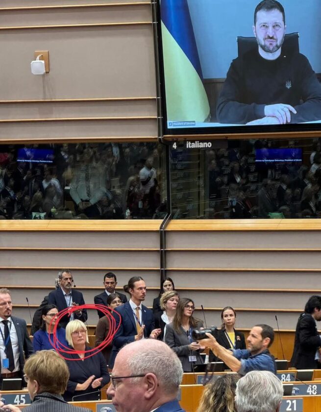 Rendkívüli Európai Parlamenti ülés volt,  amelyen felszólalt Zelenszkij, ukrán elnök is. Gál Kinga (aki egyébként a Fidesz legmagasabb rangú EP-képviselője, a Fideszt is magában foglaló szélsőjobbos frakció alelnöke) mégis állva tapsolja Zelenszkijt.
