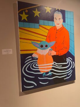 Mondjuk drMáriás: OV megvédi a koronavírustól Baby Yodát az Európai Parlamentben című képét, vagy Weiler Péter: Kádár János a kertjében a letartóztatását várja című alkotását.
