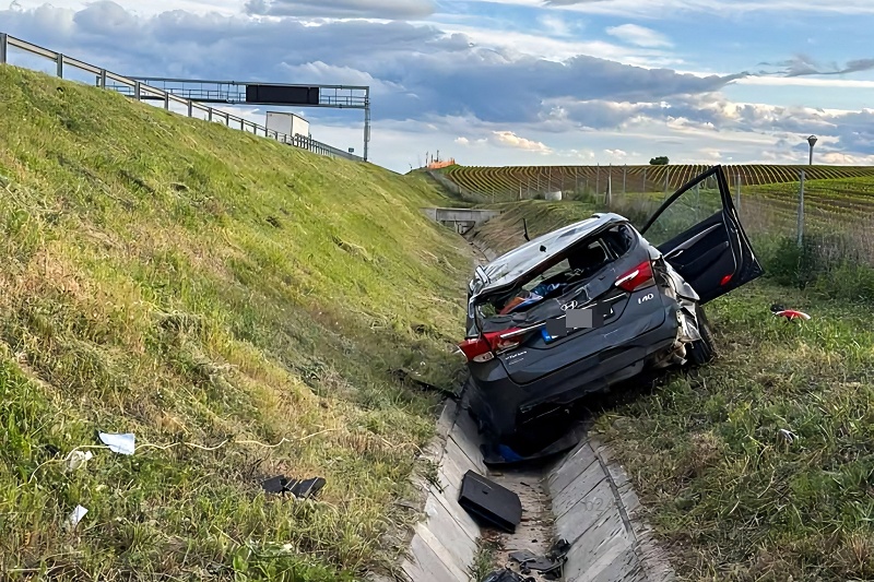 Ekkor az irányíthatatlanná vált Hyundai kisodródott, majd éppen azon a szakaszon, ahol nincs szalagkorlát, az árokba hajtott. Nagyjából 150 méter megtétele után a meredek partfalról az autó lecsúszott, átpördült a tetején, végül a betonozott vízelvezető árokban, a kerekein landolt. A sofőr szerencsére megúszta sérülések nélkül a balesetet, ám autója rommá tört. (Fotók és műszaki mentés: dannystowing.eu)