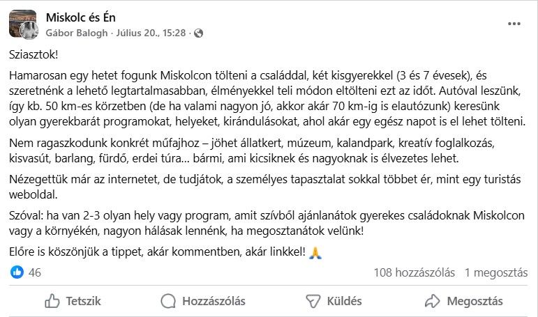 Szóval: ha van 2-3 olyan hely vagy program, amit szívből ajánlanátok gyerekes családoknak Miskolcon vagy a környékén, nagyon hálásak lennénk, ha megosztanátok velünk!
