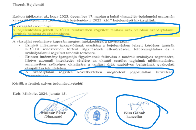 2023 őszére a beírt, kifizetett, de meg nem tartott tanórák száma meghaladta az ezret – állítja T. István, aki bejelentést tett a Miskolci Szakképzési Centrumban a bejelentési csatornán. (Pár évvel ezelőtt egy budapesti gimnázium tanárait 1-2 meg nem tartott óra miatt rúgták ki, pedig ők pénzt sem vettek fel érte.)
