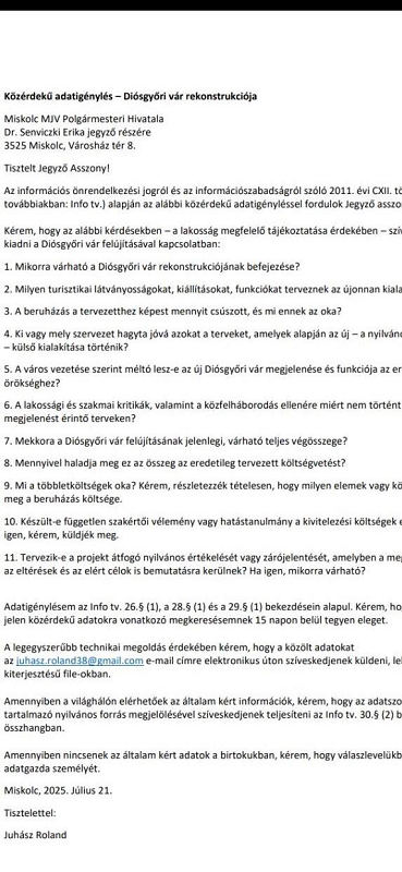 Néhány nappal ezelőtt közérdekű adatigényléssel fordultam a városhoz, hogy végre pontos képet kapjunk arról, mi történik a Diósgyőri Vár felújításával. A válasz megérkezett. A számok helyett azonban csak mellébeszélés. A konkrétumok helyett általánosságok. A problémák viszont – sajnos – nagyon is világosak.”