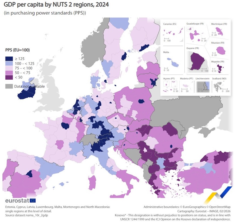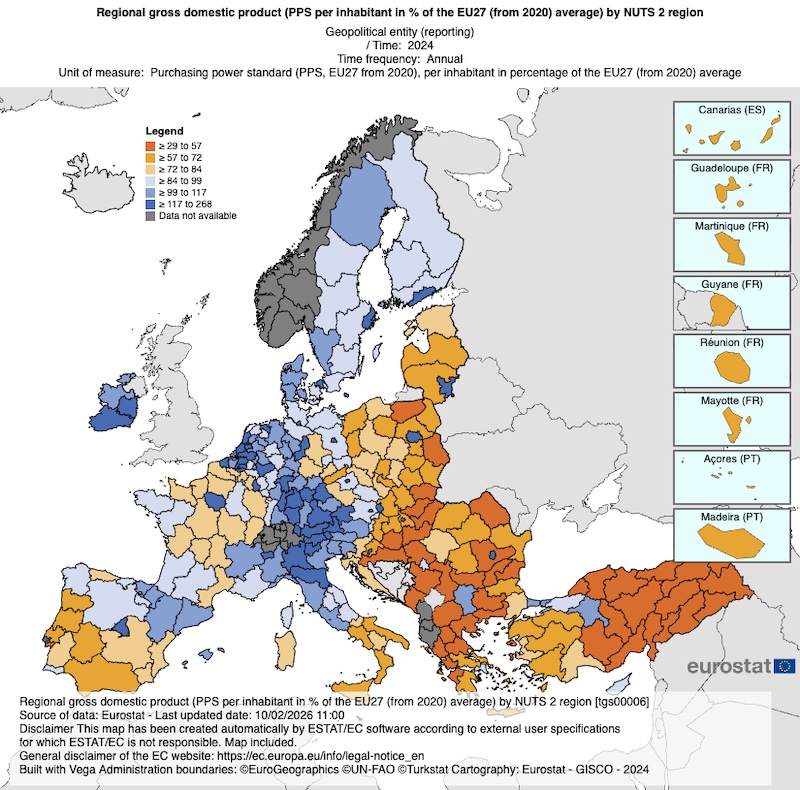 Éles ellentétben áll mindezzel Budapest helyzete. A főváros az Európai Unió tizenegyedik legfejlettebb régiójának számít, az uniós átlag százhatvannyolc százalékán teljesítve. Ez a szint megközelíti olyan nagyvárosokét, mint Hamburg, Prága vagy Brüsszel, bár még mindig elmarad a top tízes Bukaresttől, amely száznyolcvannyolc százalékos értéket ért el.