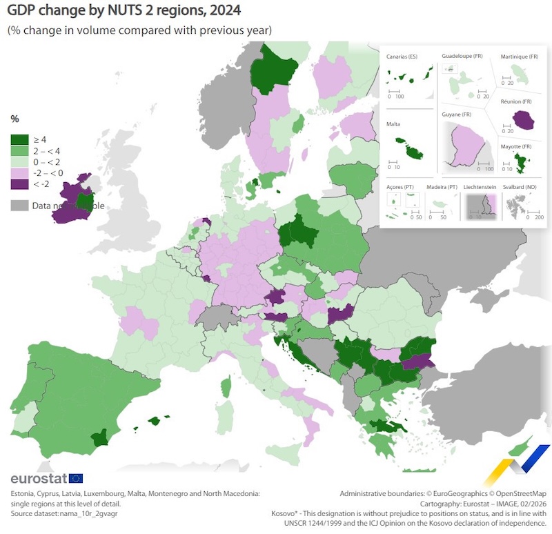 A gazdasági dinamika sem ad okot bizakodásra. 2024-ben a hét magyarországi régió közül négyben csökkent a GDP, háromban stagnálás közeli helyzet alakult ki, és csak Budapesten volt szemmel látható bővülés. A recesszió különösen súlyosan érintette a Szeged központú Dél-Alföldet, ahol a visszaesés meghaladta a két százalékot. Emellett Észak-Magyarország, Közép-Dunántúl és Nyugat-Dunántúl teljesítménye is csökkent.