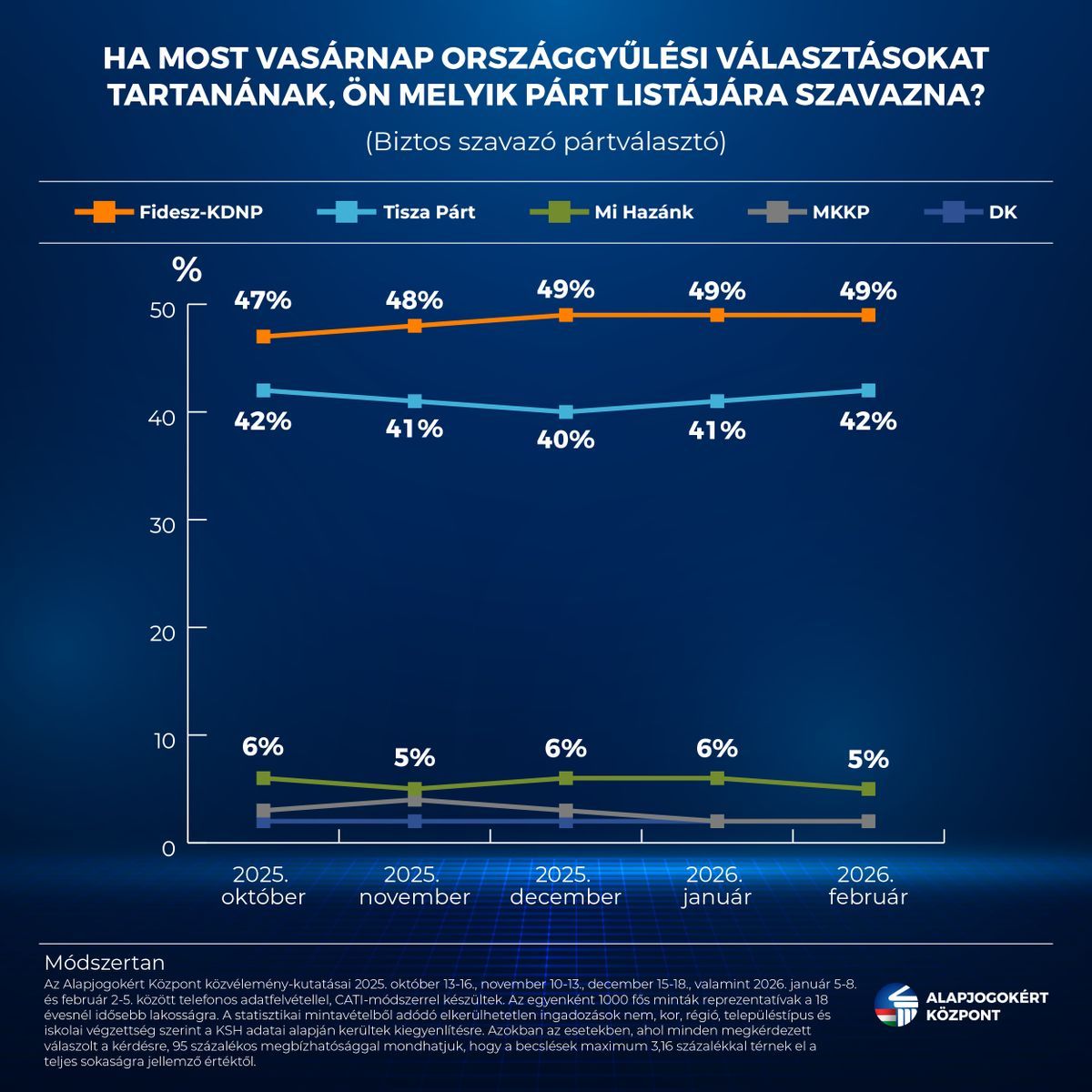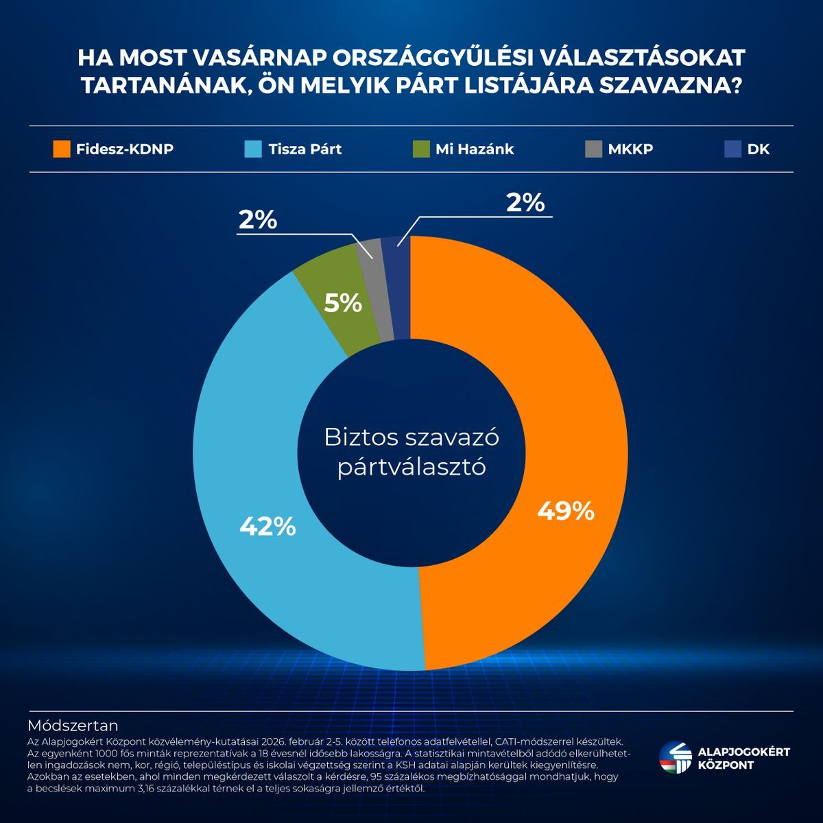 A Fidesz–KDNP országos listáját a biztos szavazó pártválasztók 49 százaléka támogatná egy most vasárnap esedékes választáson, míg a Tisza Pártra 42 százalékuk voksolna – derül ki az Alapjogokért Központ friss, országosan reprezentatív közvélemény-kutatásából, írja a Magyar Nemzet.